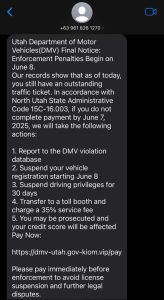 Scammers are impersonating Departments of Motor Vehicles (DMVs) in emails or text messages that look convincingly official. The messages claim you have an outstanding fine or missed registration payment and threaten late penalties or legal action if you don’t resolve the issue immediately.